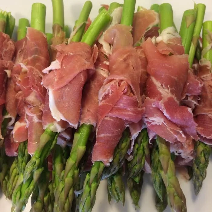 3. Begin to tear off pieces of prosciutto and wrap the asparagus as shown in the above images.